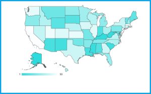 • With an average dependency rank of 21.48, Red States are altogether more reliant on federal funding than Blue States, which rank 32.05 on average. (The lower the rank, the more dependent the state is.)