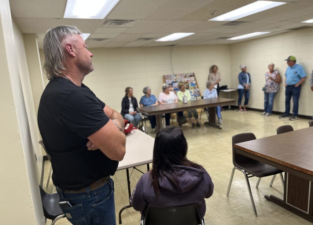 Jared Bossly stands with his arms crossed as fellow landowners stand with him in solidarity in the Brown County Courthouse basement after a court hearing on May 31, 2023, in Aberdeen, South Dakota. (Photo by Joshua Haiar/South Dakota Searchlight)