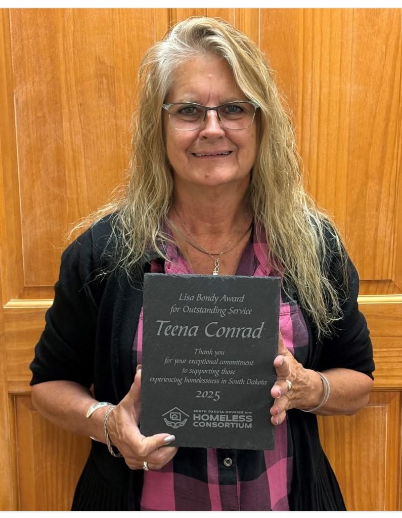 Teena Conrad, the SSVF program manager at Cornerstone Rescue Mission is the recipient of the Lisa Bondy award for outstanding Service. This award is received by an individual who has made a sustained and significant impact on addressing homelessness in South Dakota. Dedication, achievements and vision are determinations for the recipient of this award.