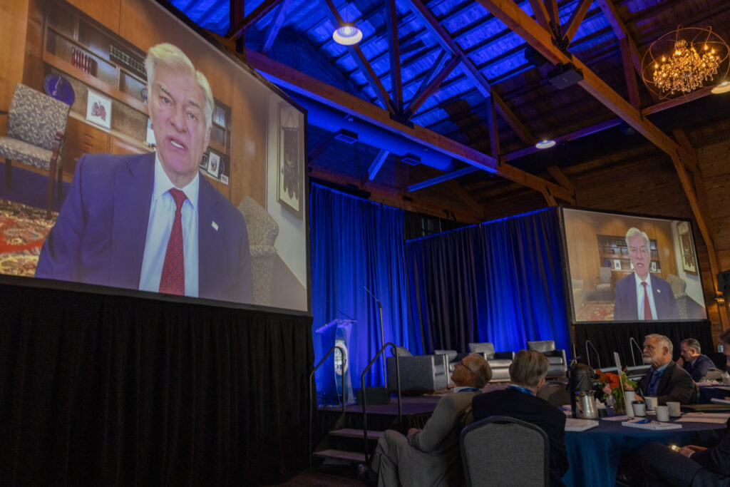 Mehmet Oz, administrator of the Centers for Medicare and Medicaid Services, speaks via video at the fourth annual Summit on the Future of Rural Health Care hosted by Sanford Health on Oct. 14, 2025, in Sioux Falls, South Dakota. (Photo courtesy of Sanford Health)
