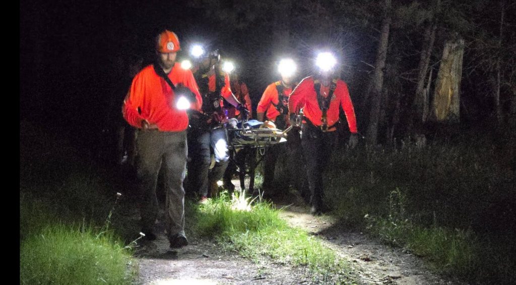 Crews hiked gear into the area and reached the patient around 9:50pm. The patient was placed in a stokes basket, as he wasnโt able to hike out on his own. A rope system was setup to get the patient up the rock scree to a location where he could be wheeled out.