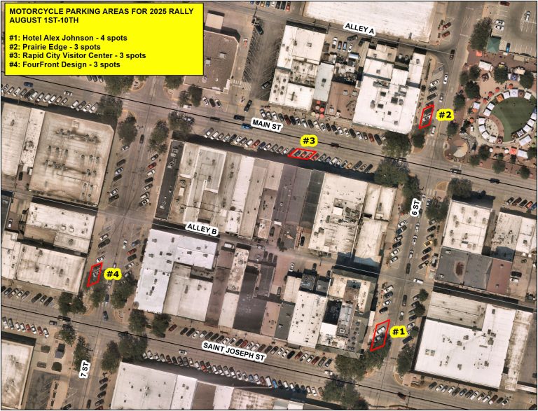 RAPID CITY, SD–The City of Rapid City is partnering with four downtown businesses to offer free motorcycle parking for the