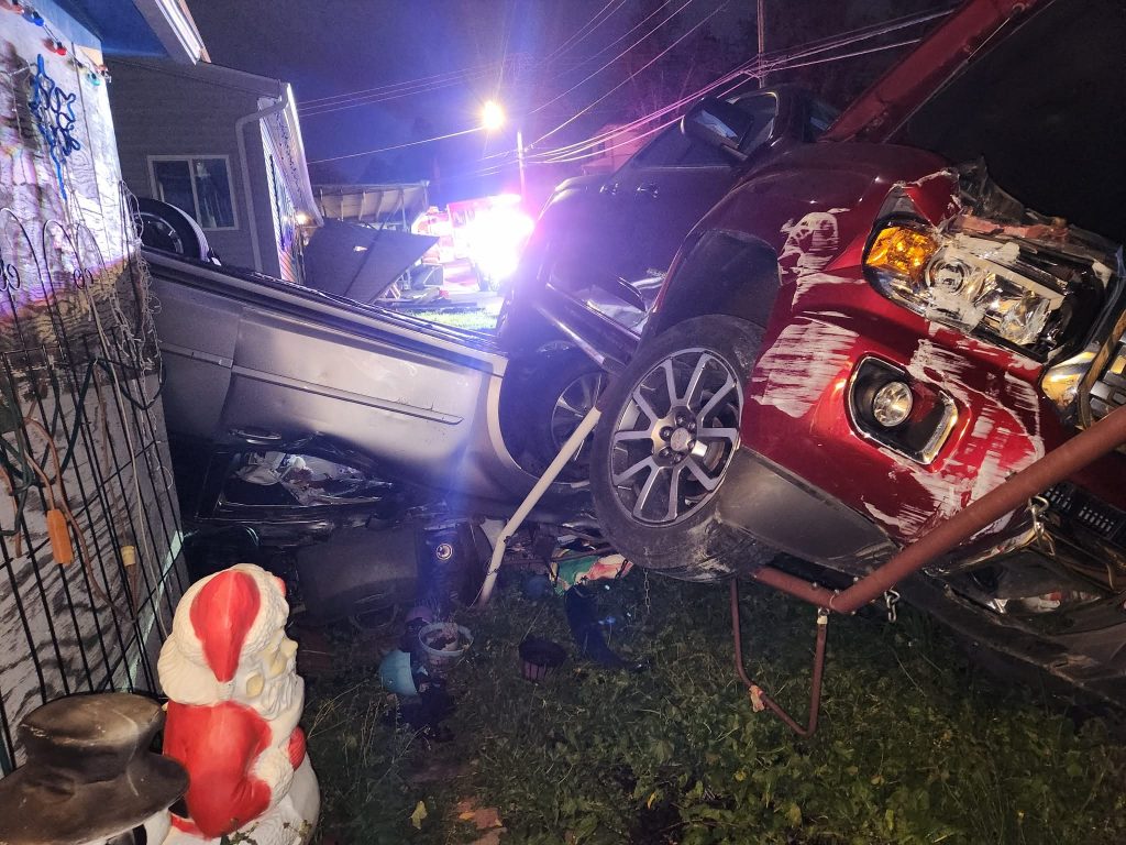 Upon arrival, firefighters discovered a vehicle had left the road way, impacting a garage and a second parked motor vehicle – rolling the second vehicle and coming to a stop on top of it.