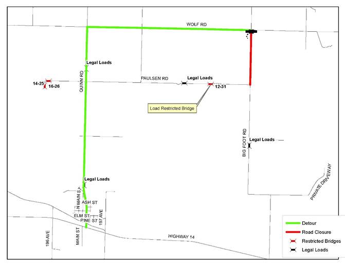 Beginning Monday, August 25, a portion of Big Foot Road will be closed from Wolf Road south to Paulsen Road. The closure is for culvert work and is expected to last through Thursday, August 28. Detours will be in place to guide motorists around the work zone.