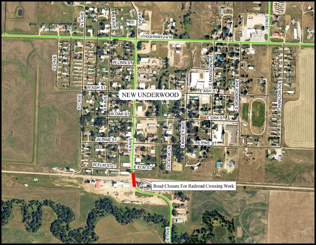 In New Underwood, South A Avenue will be closed for railroad crossing work. The closure is scheduled from Tuesday, August 26, through Thursday, August 28, and a detour will be available for drivers.