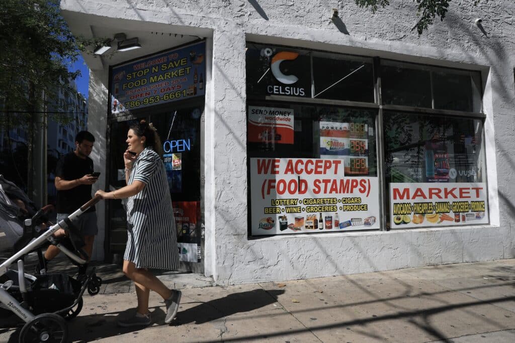 A ‘We Accept (Food Stamps)’ sign hangs in the window of a grocery store on Oct. 31, 2025 in Miami, Florida. (Photo by Joe Raedle/Getty Images)