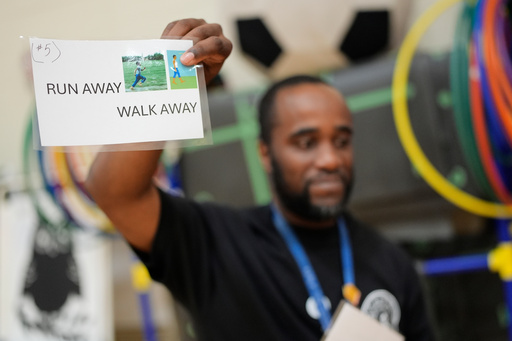 At Berclair Elementary School, the faculty designed a relay-race game to keep students engaged. In the gym, students took turns running to buckets that had different photos. Students who found a picture of a gun then reported it to one of the adults. They also listened to a catchy jingle emphasizing the steps.