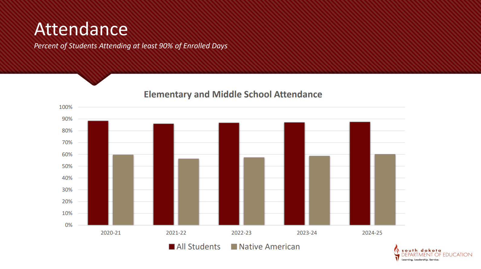 South Dakota’s attendance rate stood at 88% of students attending at least 90% of enrolled days the last school year. Among Native American students, attendance has hovered between 50% and 60% during the last five years.