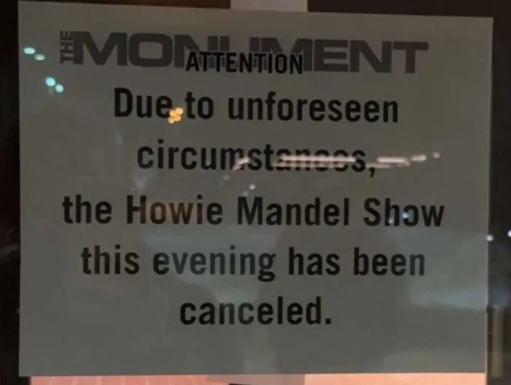 Rapid City, SD—A poster on the doors of the Monument this evening announced, “Due to unforeseen circumstances The Howie Mandel