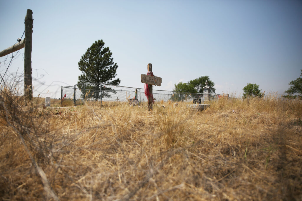 A wooden cross marks a grave at the Wounded Knee Memorial on the Pine Ridge Reservation. (Makenzie Huber/South Dakota Searchlight)