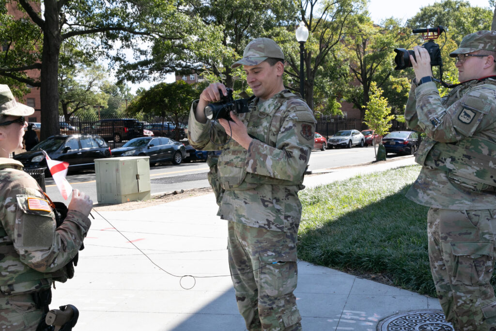 U.S. Air Force Tech. Sgt. Andrew Enriquez, right, public affairs specialist, 113th Wing, District of Columbia National Guard, and U.S. Army Spc. Gabriel Skaggs, mass communications specialist, 129th Mobile Public Affairs Detachment, South Dakota National Guard, record U.S. Army Spc. Ashley Washko, with the Alabama National Guard, for a social media video during a presence patrol in the Waterfront Metro area, Washington, D.C., Oct. 6, 2025. (U.S. Army National Guard photo by Pfc. Kylie Jorgensen)